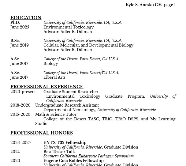 Chemotaxis assays, nematode and fly husbandry, bacterial culture maintenance, dissection, fluorescence and light microscopy, behavioral scoring, sterile technique.