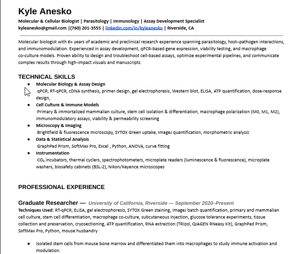 Molecular biologist with 6+ years of academic and preclinical research experience spanning parasitology, host–pathogen interactions, and immunomodulation. Experienced in assay development, qPCR-based gene expression, viability testing, and macrophage co-culture models. Proven ability to design and troubleshoot cell-based assays, optimize experimental pipelines, and communicate complex results through high-impact visuals and manuscripts.